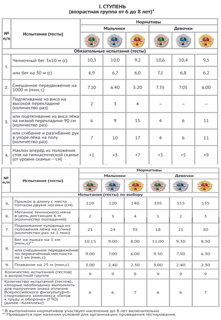 Таблица нормативов для I ступени ГТО